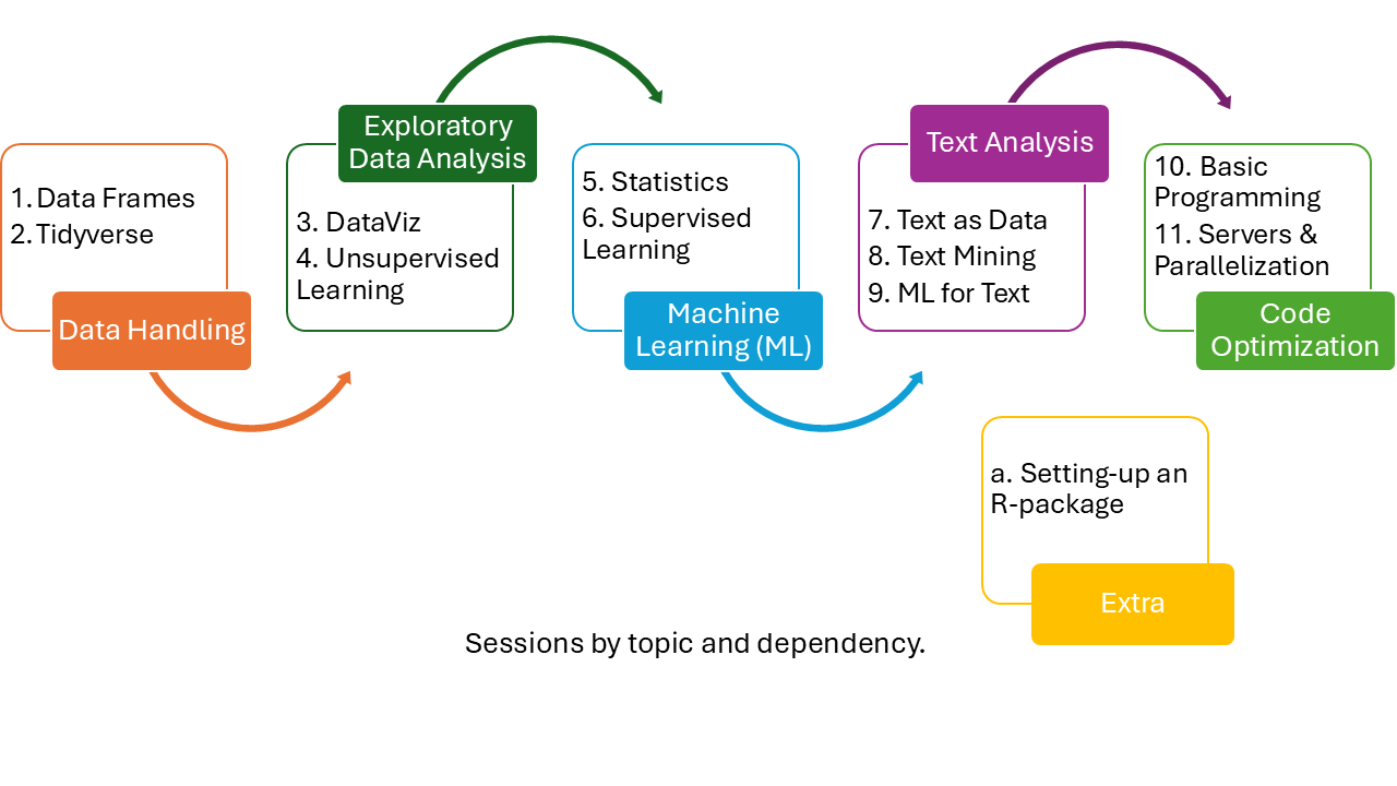 We offer R-workshops specially designed for social scientists. They were developed by Sofia Gil-Clavel, who has many years of experience teaching R to demographers and social scientists from different backgrounds (qualitative and quantitative).